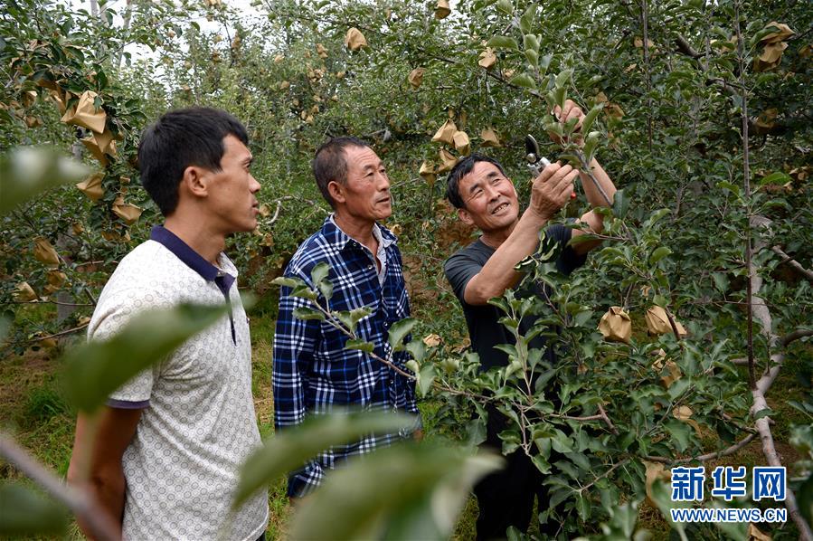 陜西延安宜川縣辛戶村村支書張延剛(右一)和村民一起查看蘋果生長情況(8月3日攝)。新華社記者 劉瀟 攝