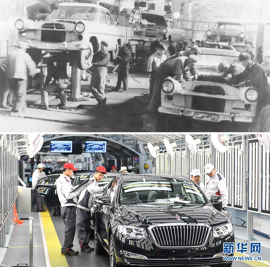 拼版照片:上圖為20世紀(jì)50年代拍攝的第一批紅旗轎車生產(chǎn)線(資料照片);下圖為在一汽紅旗總裝車間內(nèi),一汽紅旗職工在對生產(chǎn)的紅旗轎車進(jìn)行靜檢作業(yè)(新華社記者許暢2019年4月9日攝)。新華社發(fā)