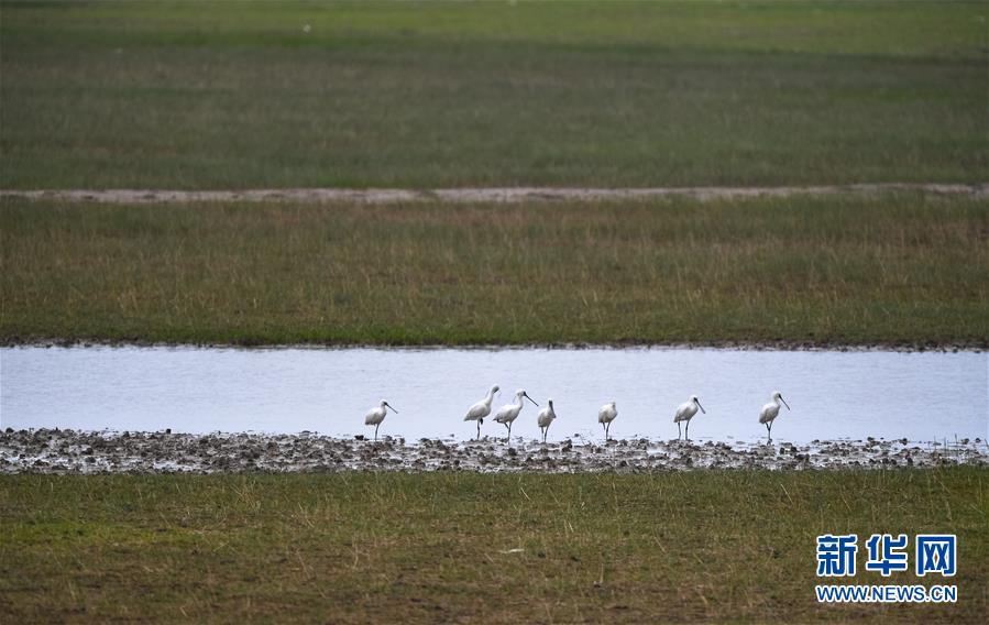 在位于江蘇鹽城東部沿海的大豐麋鹿國家級自然保護(hù)區(qū),一群黑臉琵鷺在水邊棲息(6月27日攝)。新華社記者 李響 攝
