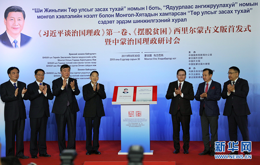 新華社烏蘭巴托8月30日電? 為慶祝中蒙建交70周年,由中國國務(wù)院新聞辦公室、蒙古國外交部、中國外文局、中國駐蒙古國大使館主辦的《習(xí)近平談治國理政》第一卷、《擺脫貧困》西里爾蒙古文版首發(fā)式暨中蒙治國理政研討會(huì)在蒙古國首都烏蘭巴托舉行。蒙古國總統(tǒng)巴特圖勒嘎發(fā)來賀信。中宣部副部長蔣建國、中國駐蒙古國大使邢海明,蒙古國副總理恩赫圖布辛、外交部長朝格特巴特爾、總統(tǒng)外事顧問特格希扎爾格勒、蒙古人民黨書記巴特恩赫等260多名代表參會(huì)。
