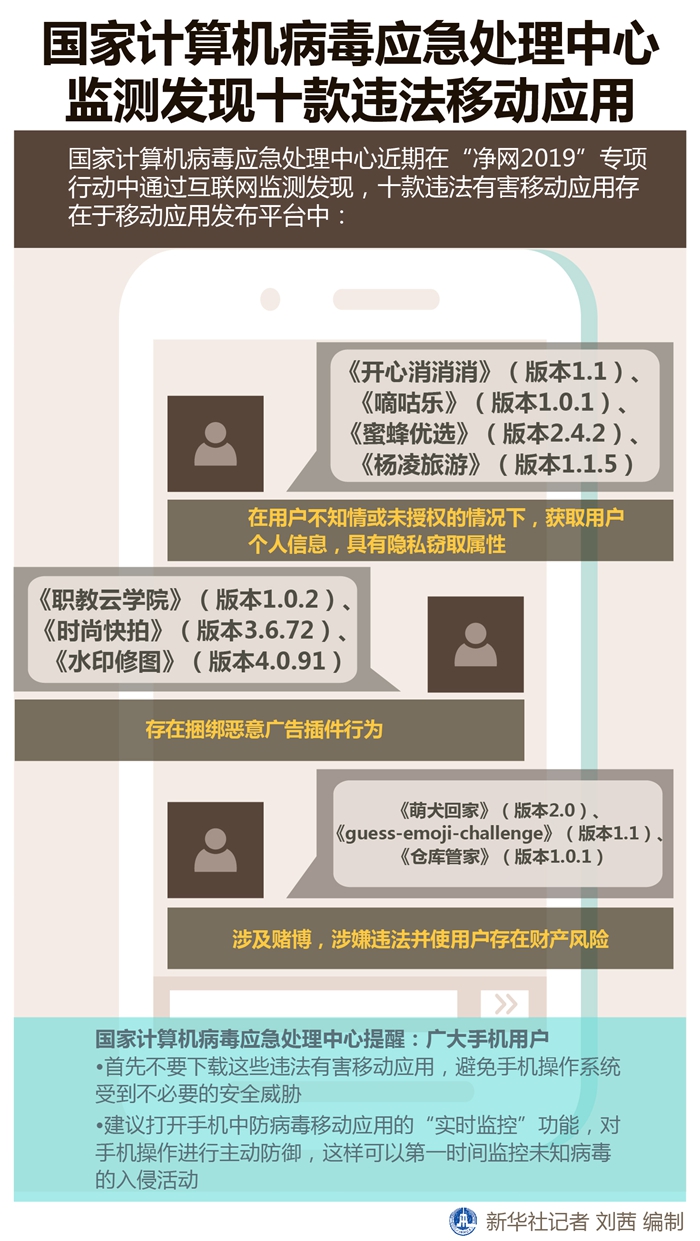 新華社天津9月15日電(記者張建新)國(guó)家計(jì)算機(jī)病毒應(yīng)急處理中心近期在“凈網(wǎng)2019”專項(xiàng)行動(dòng)中通過(guò)互聯(lián)網(wǎng)監(jiān)測(cè)發(fā)現(xiàn),十款違法有害移動(dòng)應(yīng)用存在于移動(dòng)應(yīng)用發(fā)布平臺(tái)中,其主要危害涉及隱私竊取、私自下載和賭博三類。這些違法有害移動(dòng)應(yīng)用具體如下: