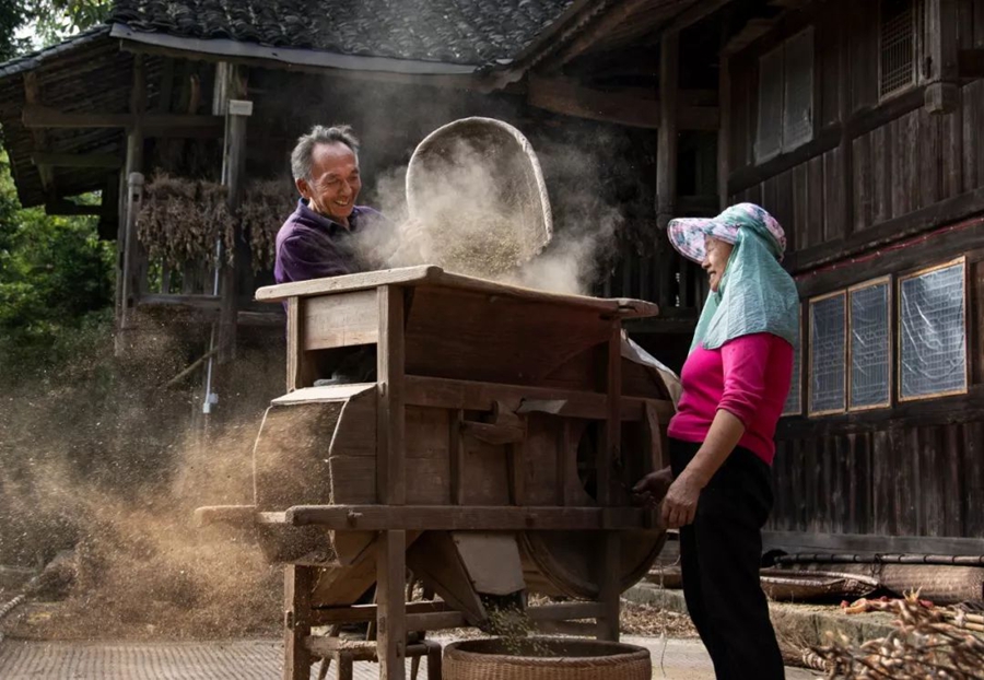 9月30日,湖北隨州。白果村一對(duì)夫婦在自家院落里忙碌。作者:大彭