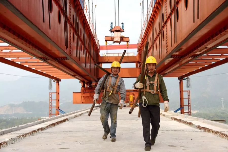 9月30日,浙江仙居。建設(shè)者們?cè)谂_(tái)金鐵路永安溪特大橋上施工。作者:王華斌