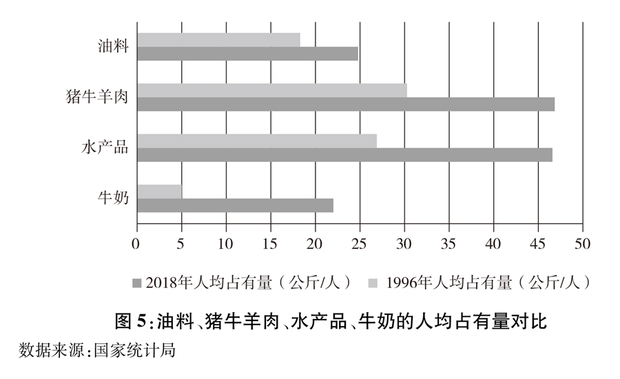 圖5:油料、豬牛羊肉、水產品、牛奶的人均占有量對比 新華社發(fā)