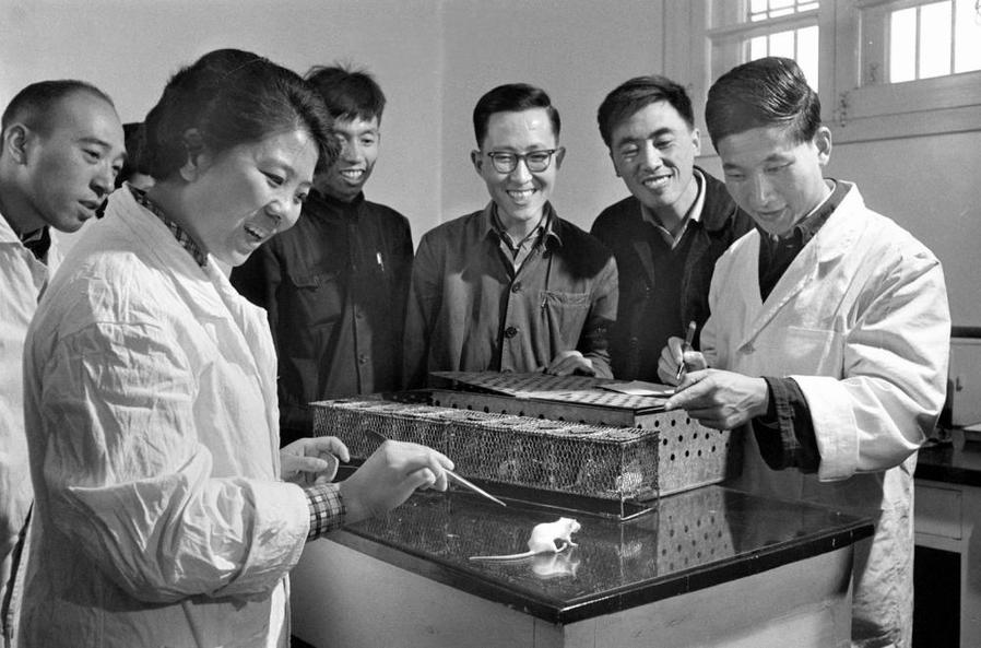 1965年9月17日,中國首次人工合成了結(jié)晶牛胰島素。圖中科學(xué)工作者正在將人工合成的產(chǎn)物注入小白鼠體內(nèi),測驗它的生物活力。新華社資料照片