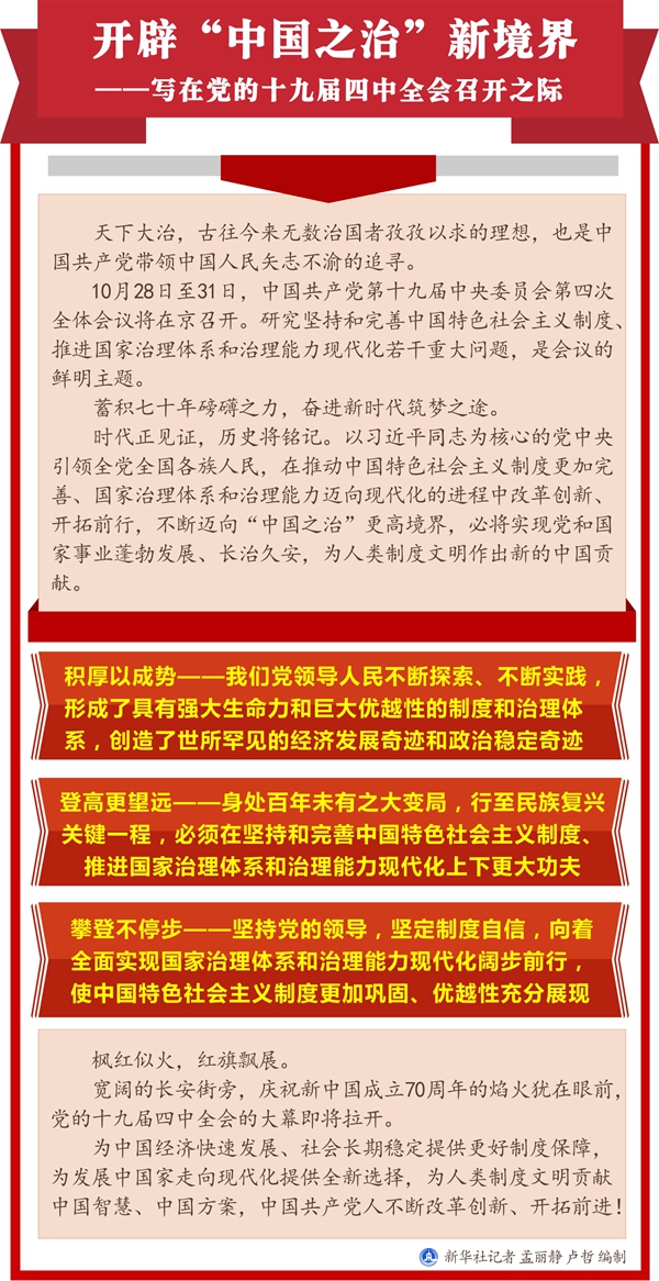 新華社北京10月27日電 題:開辟“中國之治”新境界——寫在黨的十九屆四中全會召開之際