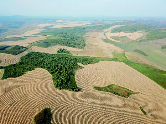 站在山腳下仰望,只見(jiàn)碧綠的山地草原上,麥田從山溝一直延伸到山坡,黃綠撞色十分扎眼。用無(wú)人機(jī)從空中俯瞰,這些農(nóng)田就像一道道傷疤。