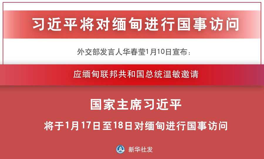 新華社北京1月10日電 外交部發(fā)言人華春瑩10日宣布:應(yīng)緬甸聯(lián)邦共和國總統(tǒng)溫敏邀請,國家主席習(xí)近平將于1月17日至18日對緬甸進(jìn)行國事訪問。
