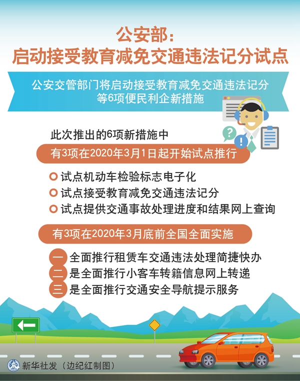 新華社北京1月14日電(劉奕湛、楊凌偉)記者14日從公安部了解到,公安交管部門將啟動(dòng)接受教育減免交通違法記分等6項(xiàng)便民利企新措施。此次推出的6項(xiàng)新措施中有3項(xiàng)在2020年3月1日起開始試點(diǎn)推行,另有3項(xiàng)在2020年3月底前全國全面實(shí)施。
