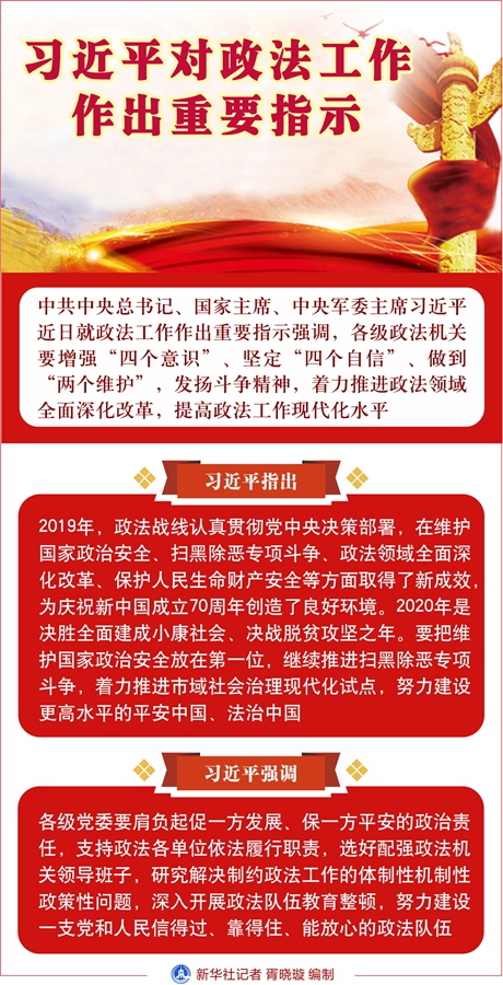 習(xí)近平指出,2019年,政法戰(zhàn)線認(rèn)真貫徹黨中央決策部署,在維護(hù)國(guó)家政治安全、掃黑除惡專項(xiàng)斗爭(zhēng)、政法領(lǐng)域全面深化改革、保護(hù)人民生命財(cái)產(chǎn)安全等方面取得了新成效,為慶祝新中國(guó)成立70周年創(chuàng)造了良好環(huán)境。2020年是決勝全面建成小康社會(huì)、決戰(zhàn)脫貧攻堅(jiān)之年。要把維護(hù)國(guó)家政治安全放在第一位,繼續(xù)推進(jìn)掃黑除惡專項(xiàng)斗爭(zhēng),著力推進(jìn)市域社會(huì)治理現(xiàn)代化試點(diǎn),努力建設(shè)更高水平的平安中國(guó)、法治中國(guó)。
