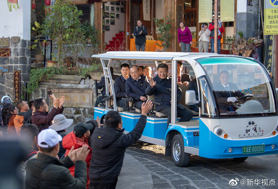 習(xí)近平總書記19日下午前往騰沖和順古鎮(zhèn)考察調(diào)研。他來到和順圖書館,察看古絲路上崇文尚教的優(yōu)良傳統(tǒng)。他沿著古鎮(zhèn)小巷步行,走進(jìn)“大馬幫博物館”,詳細(xì)了解西南絲路古道歷史和近代以來騰沖對外交流史。沿途游客看到總書記,熱情簇?fù)砩蟻恚?xí)近平同他們親切打招呼,詢問大家都來自哪里?在七彩云南走了哪些地方?有游客問:“習(xí)大大,彭麻麻呢?”總書記笑著回答說:“沒來。過年了都在家里忙著呢!”大家都會心笑了起來。古鎮(zhèn)里暖意融融,笑聲陣陣。(文字記者:張曉松、朱基釵 攝影記者:鞠鵬、謝環(huán)馳、燕雁)