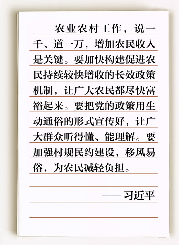 “致富路越走越寬,日子越過(guò)越紅火,全靠黨的政策好??倳浉吲d地說(shuō),農(nóng)業(yè)農(nóng)村工作,說(shuō)一千、道一萬(wàn),增加農(nóng)民收入是關(guān)鍵?!?/font>