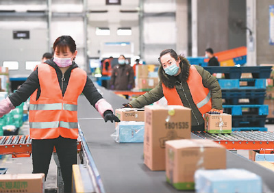 近日,位于北京市順義區(qū)的菜鳥物流倉庫在做好疫情防控的同時,穩(wěn)步有序復工復產(chǎn)。該物流倉庫目前每天處理訂單近5萬件,生產(chǎn)運營基本恢復到日常水平。圖為3月12日,在順義區(qū)菜鳥物流倉庫,幾名員工在分揀打包的商品。