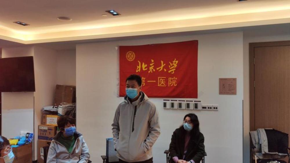 圖為北京大學(xué)第一醫(yī)院援湖北醫(yī)療隊(duì)李海潮和2019級臨床專業(yè)的學(xué)生開網(wǎng)絡(luò)會議。