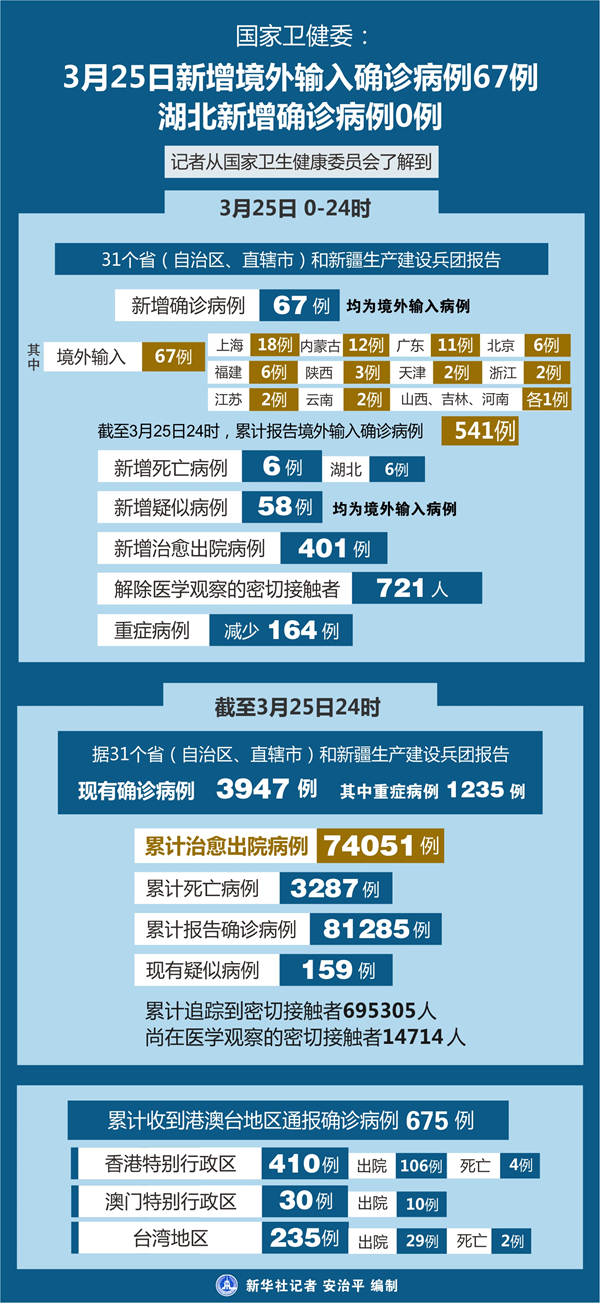 截至3月25日24時,據(jù)31個省(自治區(qū)、直轄市)和新疆生產(chǎn)建設(shè)兵團(tuán)報告,現(xiàn)有確診病例3947例(其中重癥病例1235例),累計治愈出院病例74051例,累計死亡病例3287例,累計報告確診病例81285例,現(xiàn)有疑似病例159例。累計追蹤到密切接觸者695305人,尚在醫(yī)學(xué)觀察的密切接觸者14714人。