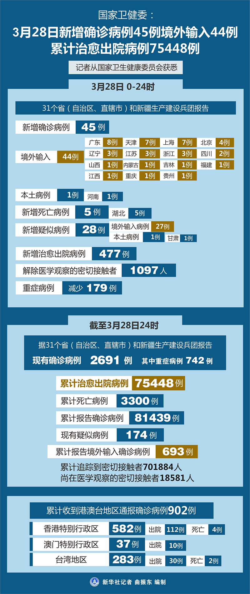 截至3月28日24時,據(jù)31個省(自治區(qū)、直轄市)和新疆生產(chǎn)建設(shè)兵團報告,現(xiàn)有確診病例2691例(其中重癥病例742例),累計治愈出院病例75448例,累計死亡病例3300例,累計報告確診病例81439例,現(xiàn)有疑似病例174例。累計追蹤到密切接觸者701884人,尚在醫(yī)學觀察的密切接觸者18581人。