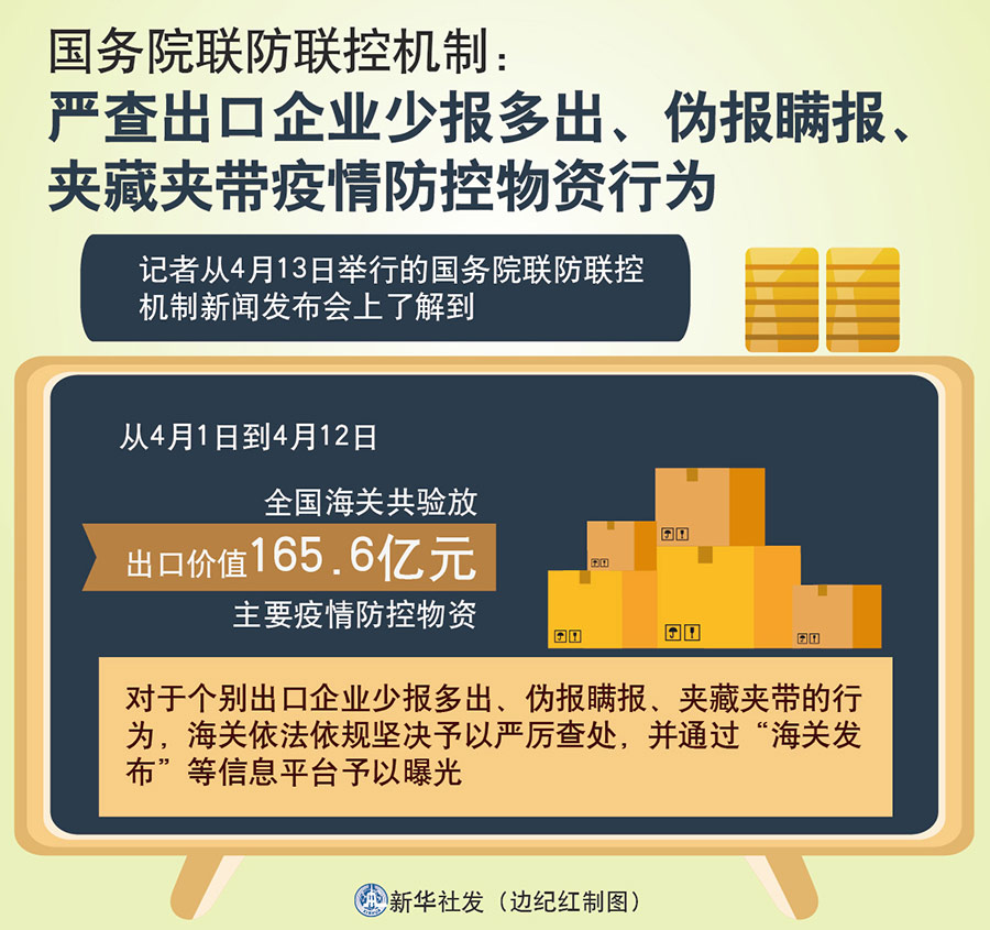 新華社北京4月13日電(記者屈婷、王鵬)記者從13日舉行的國務(wù)院聯(lián)防聯(lián)控機(jī)制新聞發(fā)布會上了解到,從4月1日到4月12日,全國海關(guān)共驗放出口價值165.6億元的主要疫情防控物資,對個別出口企業(yè)少報多出、偽報瞞報、夾藏夾帶的行為,依法依規(guī)予以嚴(yán)厲查處。