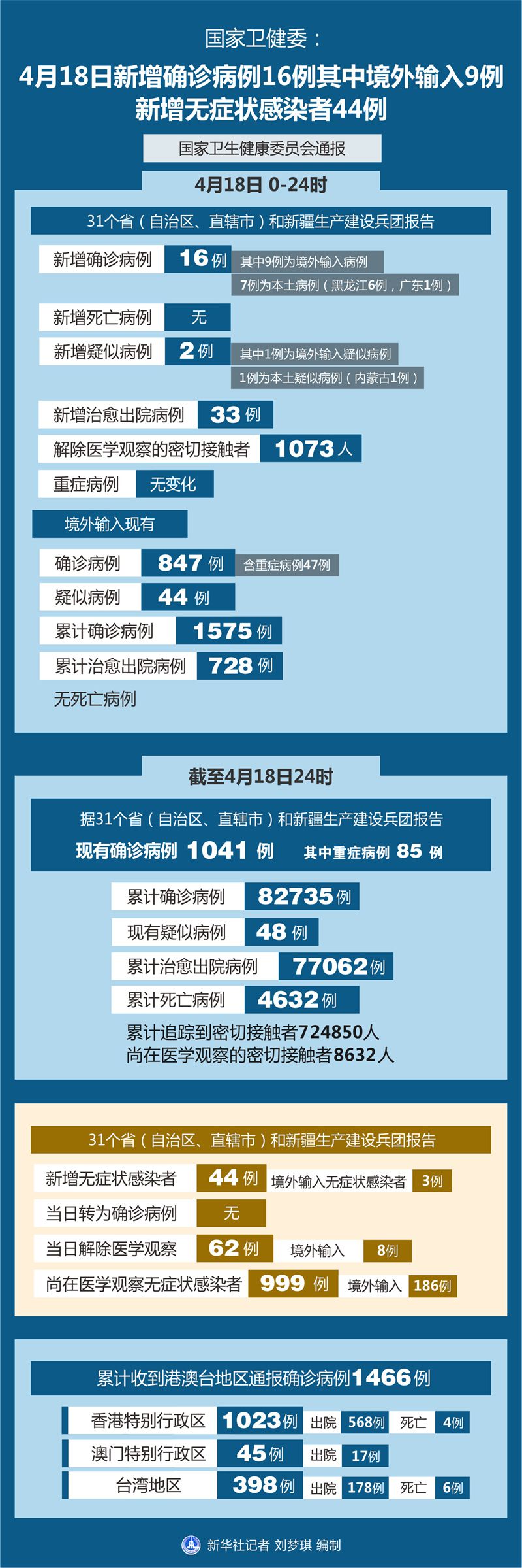 截至4月18日24時,據(jù)31個省(自治區(qū)、直轄市)和新疆生產(chǎn)建設兵團報告,現(xiàn)有確診病例1041例(其中重癥病例85例),累計治愈出院病例77062例,累計死亡病例4632例,累計報告確診病例82735例,現(xiàn)有疑似病例48例。累計追蹤到密切接觸者724850人,尚在醫(yī)學觀察的密切接觸者8632人。