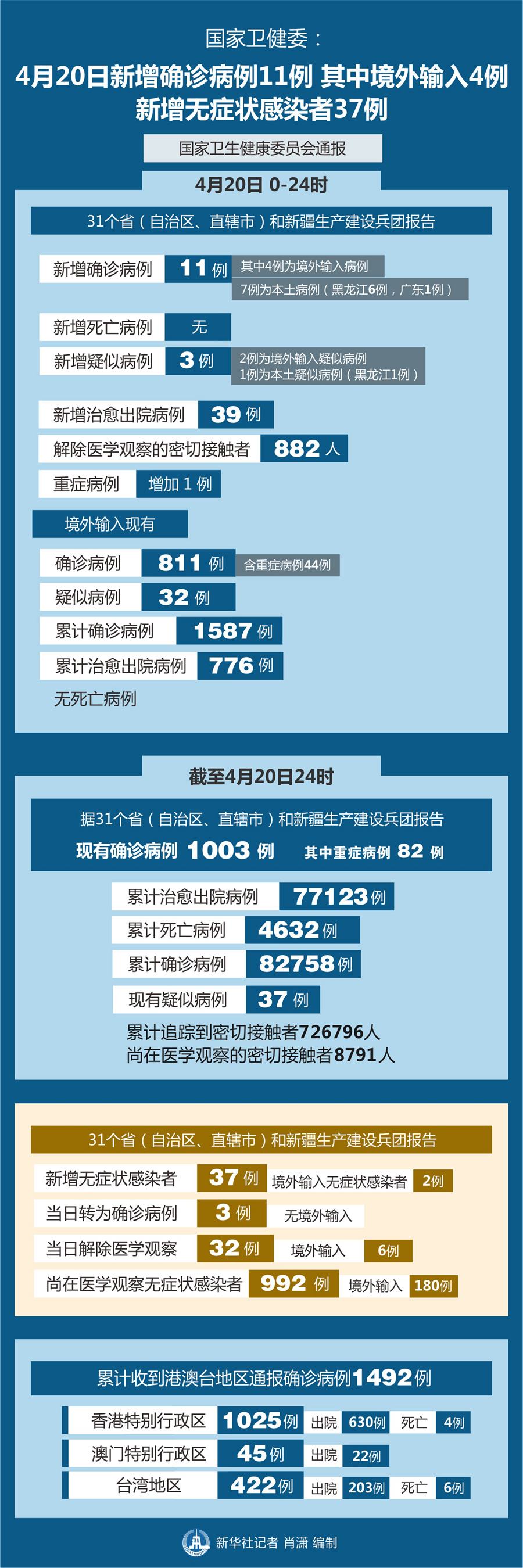 截至4月20日24時,據(jù)31個?。ㄗ灾螀^(qū)、直轄市)和新疆生產(chǎn)建設(shè)兵團(tuán)報告,現(xiàn)有確診病例1003例(其中重癥病例82例),累計治愈出院病例77123例,累計死亡病例4632例,累計報告確診病例82758例,現(xiàn)有疑似病例37例。累計追蹤到密切接觸者726797人,尚在醫(yī)學(xué)觀察的密切接觸者8791人。