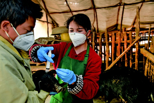周紅珍(右)由哥哥周紅山配合,給豬崽打疫苗(4月27日攝)。