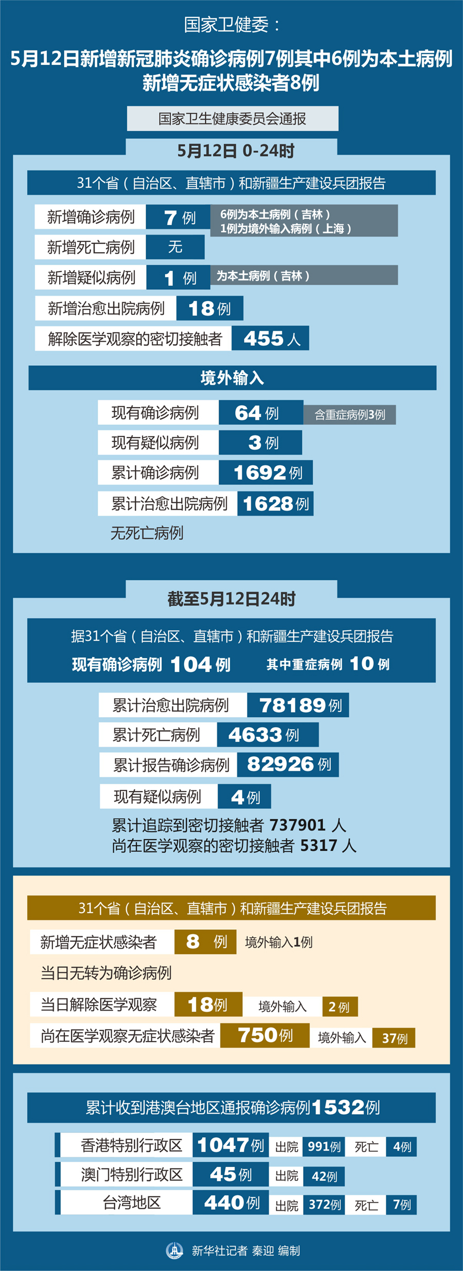 截至5月12日24時(shí),據(jù)31個(gè)?。ㄗ灾螀^(qū)、直轄市)和新疆生產(chǎn)建設(shè)兵團(tuán)報(bào)告,現(xiàn)有確診病例104例(其中重癥病例10例),累計(jì)治愈出院病例78189例,累計(jì)死亡病例4633例,累計(jì)報(bào)告確診病例82926例,現(xiàn)有疑似病例4例。累計(jì)追蹤到密切接觸者737901人,尚在醫(yī)學(xué)觀察的密切接觸者5317人。