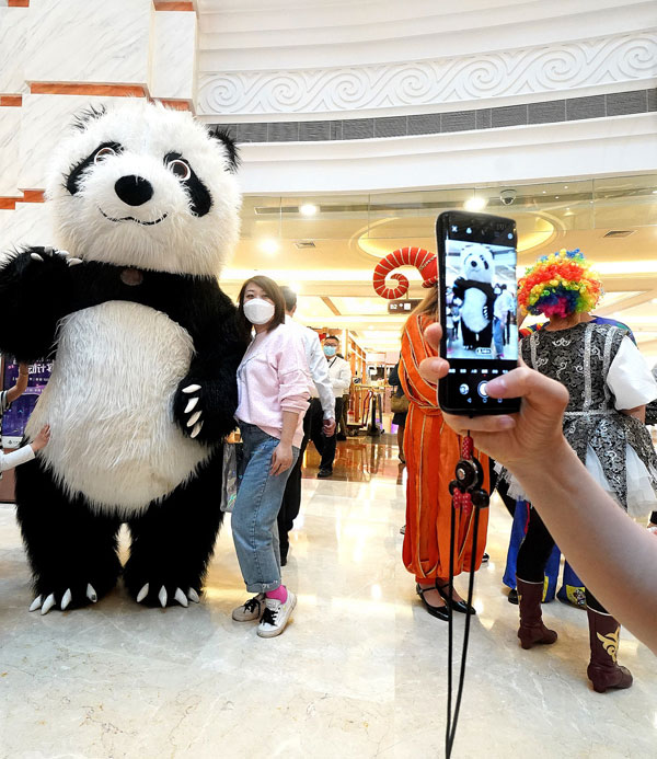 5月5日,顧客在上海環(huán)球港商場與大熊貓人偶合影 陳飛攝