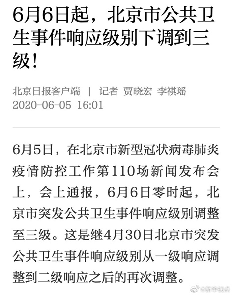 6月6日起北京公共衛(wèi)生事件響應(yīng)級別下調(diào)到三級-新華網(wǎng)