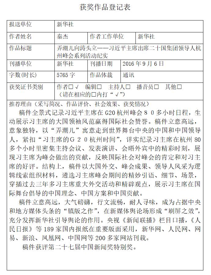 秦杰同志長(zhǎng)期承擔(dān)中央主要領(lǐng)導(dǎo)同志的采訪報(bào)道任務(wù)。無(wú)論在條件艱苦的青藏高原,還是在行程萬(wàn)里日程頻密的高訪之中,他都能不辭辛苦、日夜奮戰(zhàn),以高度的政治責(zé)任感和精益求精的職業(yè)精神出色完成任務(wù)。他參與采寫的《更高舉起改革開(kāi)放偉大旗幟——寫在鄧小平同志誕辰110周年之際》和牽頭采寫的《弄潮兒向濤頭立——習(xí)近平主席出席二十國(guó)集團(tuán)領(lǐng)導(dǎo)人杭州峰會(huì)系列活動(dòng)紀(jì)實(shí)》獲得中國(guó)新聞最高獎(jiǎng)——中國(guó)新聞獎(jiǎng)特別獎(jiǎng),參與撰寫的《中共高層新陣容》被譽(yù)為中國(guó)領(lǐng)導(dǎo)人對(duì)外報(bào)道的開(kāi)創(chuàng)性作品并獲中國(guó)新聞獎(jiǎng)一等獎(jiǎng)。他采寫的《歷史見(jiàn)證承諾》《一枝一葉總關(guān)情》等報(bào)道成為時(shí)政報(bào)道領(lǐng)域不可多得的精品。