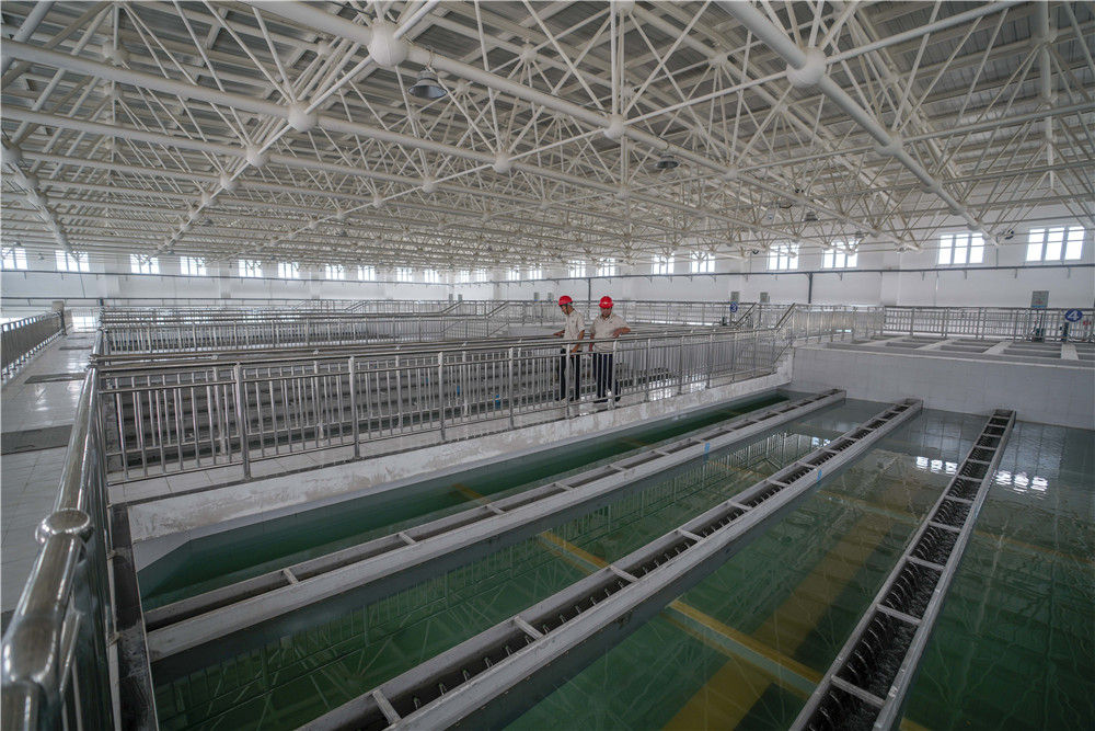 在新疆喀什地區(qū)城鄉(xiāng)供水總水廠里,工作人員檢查清水池工作情況(6月8日攝)。這些安全水將通過近112公里的主管道直達伽師縣,供應(yīng)當(dāng)?shù)鼐用裼盟?/span>新華社記者 趙戈 攝