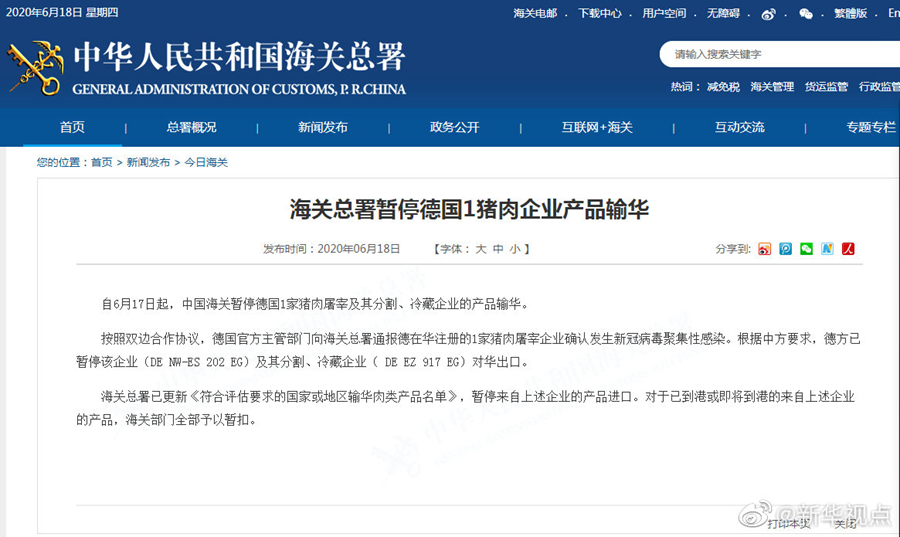 海關(guān)總署18日發(fā)布公告,自6月17日起,中國(guó)海關(guān)暫停德國(guó)一家豬肉屠宰及其分割、冷藏企業(yè)的產(chǎn)品輸華。按照雙邊合作協(xié)議,德國(guó)官方主管部門向海關(guān)總署通報(bào)德在華注冊(cè)的一家豬肉屠宰企業(yè)確認(rèn)發(fā)生新冠病毒聚集性感染。根據(jù)中方要求,德方已暫停該企業(yè)及其分割、冷藏企業(yè)對(duì)華出口。海關(guān)總署已更新《符合評(píng)估要求的國(guó)家或地區(qū)輸華肉類產(chǎn)品名單》,暫停來自上述企業(yè)的產(chǎn)品進(jìn)口。對(duì)于已到港或即將到港的來自上述企業(yè)的產(chǎn)品,海關(guān)部門全部予以暫扣。(記者劉紅霞)