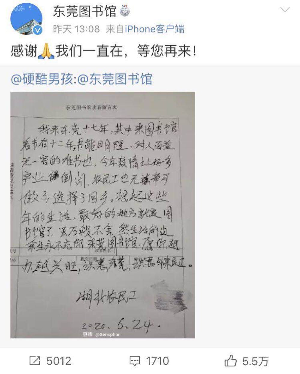 “我來東莞十七年,其中來圖書館看書有十二年。書能明理,對人百益無一害的唯書也。今年疫情讓好多產(chǎn)業(yè)(企業(yè))倒閉,農(nóng)民工也無事可做了,選擇了回鄉(xiāng)。想起這些年的生活,最好的地方就是圖書館了。雖萬般不舍,然生活所迫,余生永不忘你,東莞圖書館,愿你越辦越興旺。識惠東莞,識惠外來農(nóng)民工?!?/span>