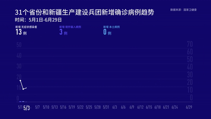 6月29日0—24時(shí),31個(gè)?。ㄗ灾螀^(qū)、直轄市)和新疆生產(chǎn)建設(shè)兵團(tuán)報(bào)告新增確診病例19例,其中境外輸入病例11例(廣東4例,上海3例,四川3例,甘肅1例),本土病例8例(北京7例,上海1例);無(wú)新增死亡病例;新增疑似病例1例,為境外輸入病例(在上海)。