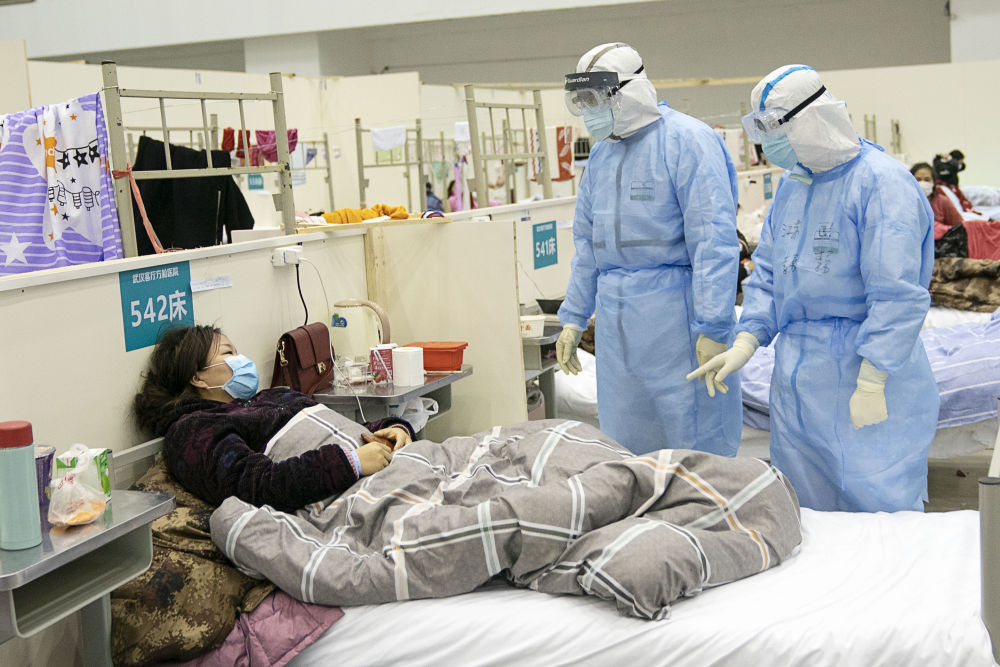 武漢客廳方艙醫(yī)院醫(yī)護人員在詢問患者病情(新華社記者熊琦攝)