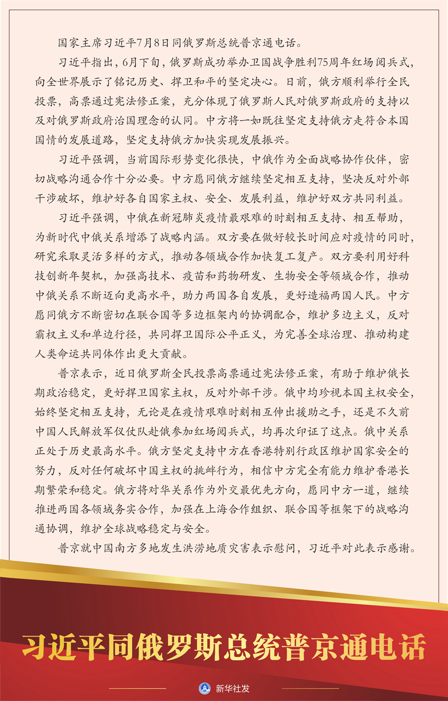 習(xí)近平指出,6月下旬,俄羅斯成功舉辦衛(wèi)國戰(zhàn)爭勝利75周年紅場閱兵式,向全世界展示了銘記歷史、捍衛(wèi)和平的堅(jiān)定決心。日前,俄方順利舉行全民投票,高票通過憲法修正案,充分體現(xiàn)了俄羅斯人民對俄羅斯政府的支持以及對俄羅斯政府治國理念的認(rèn)同。中方將一如既往堅(jiān)定支持俄方走符合本國國情的發(fā)展道路,堅(jiān)定支持俄方加快實(shí)現(xiàn)發(fā)展振興。