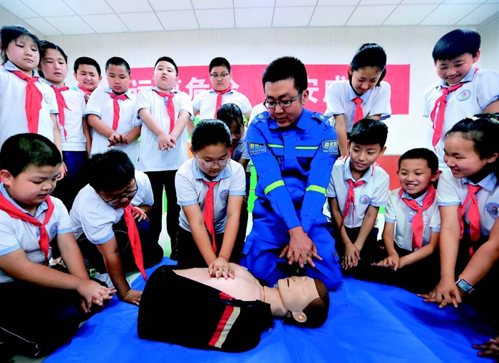 6月23日,山東省青島市即墨區(qū)藍(lán)天救援隊(duì)的志愿者為華山路小學(xué)的學(xué)生講解心肺復(fù)蘇技能 梁孝鵬攝