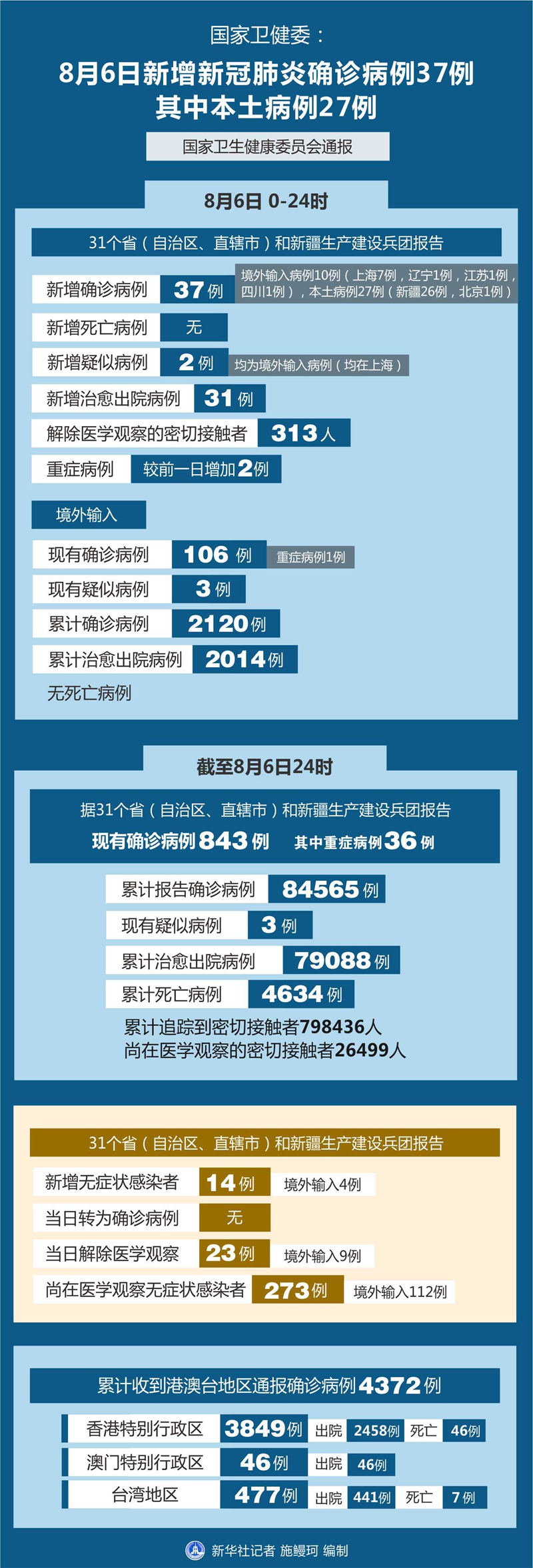 新華社北京8月7日電 國家衛(wèi)生健康委員會7日通報,8月6日0-24時,31個?。ㄗ灾螀^(qū)、直轄市)和新疆生產(chǎn)建設(shè)兵團報告新增新冠肺炎確診病例37例,其中境外輸入病例10例(上海7例,遼寧1例,江蘇1例,四川1例),本土病例27例(新疆26例,北京1例);無新增死亡病例;新增疑似病例2例,均為境外輸入病例(均在上海)。