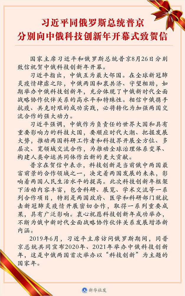 新華社北京8月26日電 國家主席習近平和俄羅斯總統(tǒng)普京26日分別致信祝賀中俄科技創(chuàng)新年開幕。