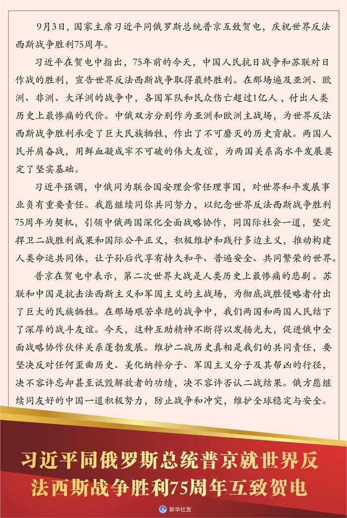 普京在賀電中表示,第二次世界大戰(zhàn)是人類歷史上最慘痛的悲劇。蘇聯(lián)和中國是抗擊法西斯主義和軍國主義的主戰(zhàn)場,為徹底戰(zhàn)勝侵略者付出了巨大的民族犧牲。在那場艱苦卓絕的戰(zhàn)爭中,我們兩國和兩國人民結(jié)下了深厚的戰(zhàn)斗友誼。今天,這種互助精神不斷得以發(fā)揚光大,促進俄中全面戰(zhàn)略協(xié)作伙伴關(guān)系蓬勃發(fā)展。維護二戰(zhàn)歷史真相是我們的共同責(zé)任,要堅決反對任何歪曲歷史、美化納粹分子、軍國主義分子及其幫兇的行徑,決不容許忘卻甚至詆毀解放者的功績,決不容許否認(rèn)二戰(zhàn)結(jié)果。俄方愿繼續(xù)同友好的中國一道積極努力,防止戰(zhàn)爭和沖突,維護全球穩(wěn)定與安全。