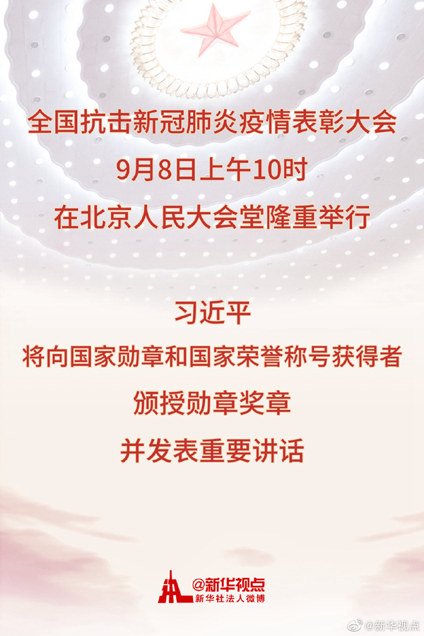 新華社北京9月6日電? 全國抗擊新冠肺炎疫情表彰大會將于9月8日上午10時在北京人民大會堂隆重舉行。中共中央總書記、國家主席、中央軍委主席習近平將向國家勛章和國家榮譽稱號獲得者頒授勛章獎?wù)虏l(fā)表重要講話。