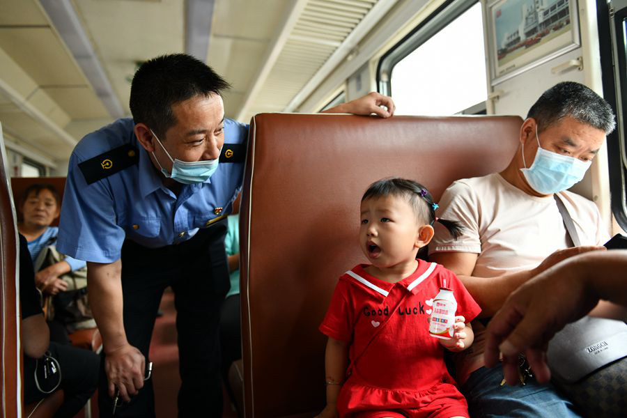 8月22日,在從陽平關返回漢中的8362次列車上,列車長修寶成與小旅客交流。?