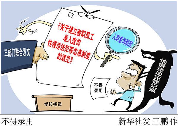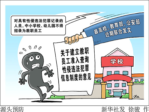 新華社北京9月18日電(記者陳菲)為加強對性侵未成年人犯罪的源頭預(yù)防,最高檢、教育部、公安部近期聯(lián)合發(fā)文,要求在全國建立入職查詢制度,對具有性侵違法犯罪記錄的人員,中小學(xué)校、幼兒園不得錄用,教師認(rèn)定機(jī)構(gòu)不得認(rèn)定教師資格。