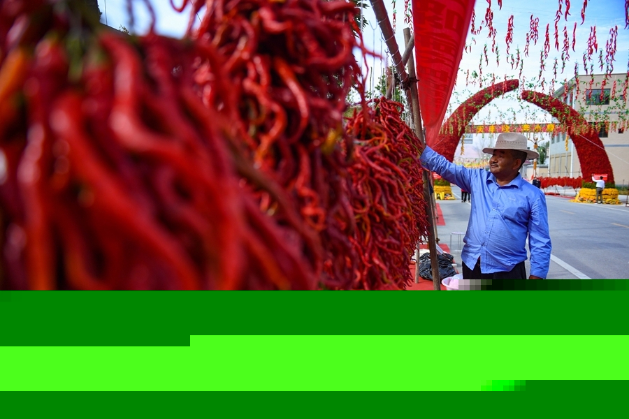 農(nóng)戶在2020年慶祝中國農(nóng)民豐收節(jié)暨循化縣消費(fèi)扶貧“辣椒節(jié)”現(xiàn)場(chǎng)銷售線辣椒。(新華網(wǎng)潘彬彬 攝)