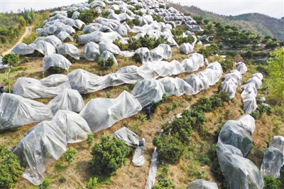用薄膜作為重要農(nóng)業(yè)生產(chǎn)資料被廣泛使用,圖為貴州省黔東南苗族侗族自治州榕江縣砂糖橘種植基地,村民為砂糖橘覆蓋農(nóng)膜保溫。新華社記者 楊楹攝