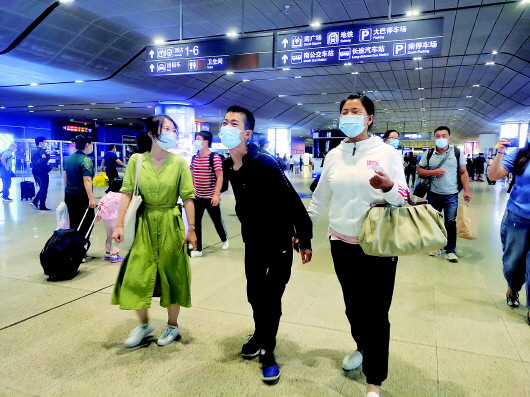王唯佳(中)到達(dá)天津火車(chē)站,在輔導(dǎo)員高雨桐(左)和家人陪伴下走向南開(kāi)大學(xué)校車(chē)。本報(bào)記者白佳麗攝