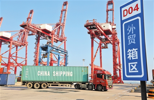 近日,運輸車輛在江蘇連云港集裝箱碼頭轉(zhuǎn)運集裝箱準(zhǔn)備裝船出口國外。 海關(guān)總署發(fā)布的數(shù)據(jù)顯示,今年前8個月,我國貨物貿(mào)易進(jìn)出口總值20.05萬億元,同比下降0.6%,降幅持續(xù)收窄,接近“轉(zhuǎn)正”。