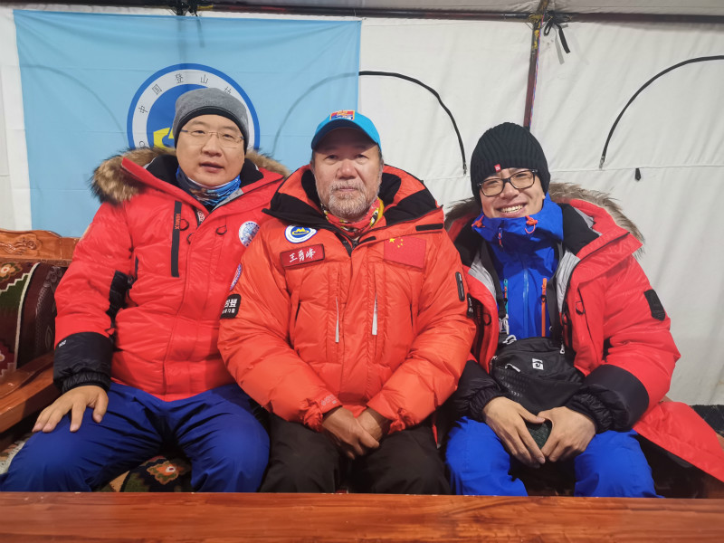 谷業(yè)凱(右)與中國(guó)登山隊(duì)隊(duì)長(zhǎng)王勇峰(中)、人民日?qǐng)?bào)記者袁泉(左)登頂前夜在珠峰大本營(yíng)。