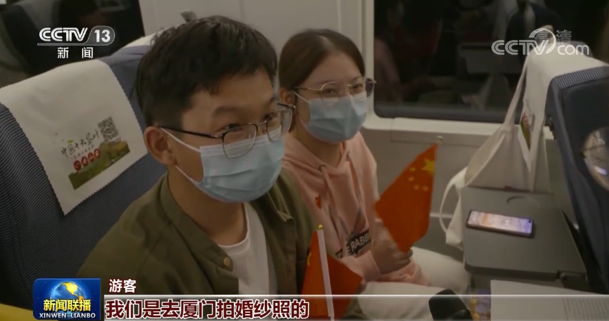 游客:我們是去廈門拍婚紗照的,沿邊的風(fēng)景都很好看,我們剛才把五星紅旗跟藍天還比著,拍了個照片,每天都讓我們自己有種愛上祖國新的那種感動。