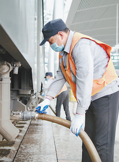 吸污組沿著狹長(zhǎng)的車廂線作業(yè),隊(duì)員的耳麥里,不時(shí)響起離站時(shí)間的提醒。以車廂為界,一側(cè)是匆忙下車的旅客,一側(cè)是緊張作業(yè)的小分隊(duì)。