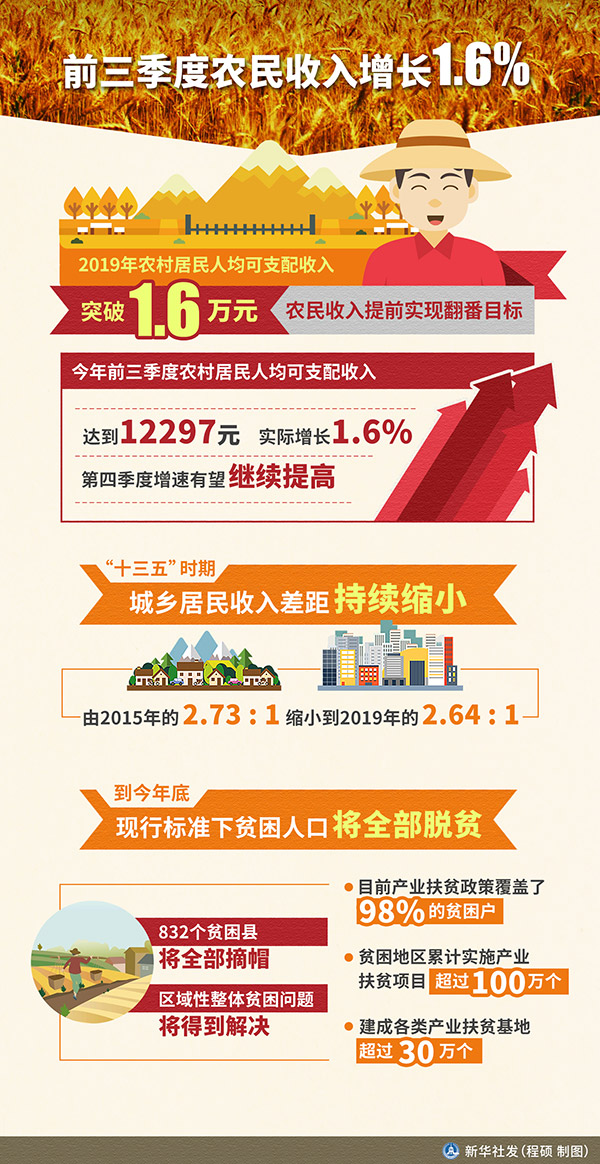 新華社北京10月27日電(記者于文靜)農(nóng)業(yè)農(nóng)村部副部長劉煥鑫27日表示,2019年農(nóng)村居民人均可支配收入突破1.6萬元,農(nóng)民收入提前實(shí)現(xiàn)翻番目標(biāo)。今年前三季度農(nóng)村居民人均可支配收入達(dá)到12297元,實(shí)際增長1.6%,第四季度增速有望繼續(xù)提高,小康之年農(nóng)民將有更多獲得感。
