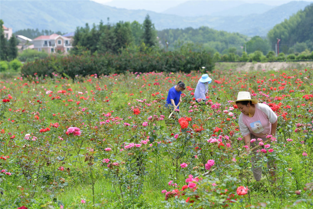在江西省修水縣黃沙鎮(zhèn)湯橋村的易地扶貧搬遷安置點(diǎn),村民在花卉種植基地里勞作(5月20日攝)。新華社記者 彭昭之 攝